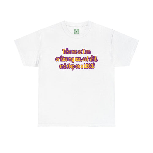 "Take me as I am or kiss may ass, eat shit, and step on a LEGO!" - Unisex Heavy Cotton Tee