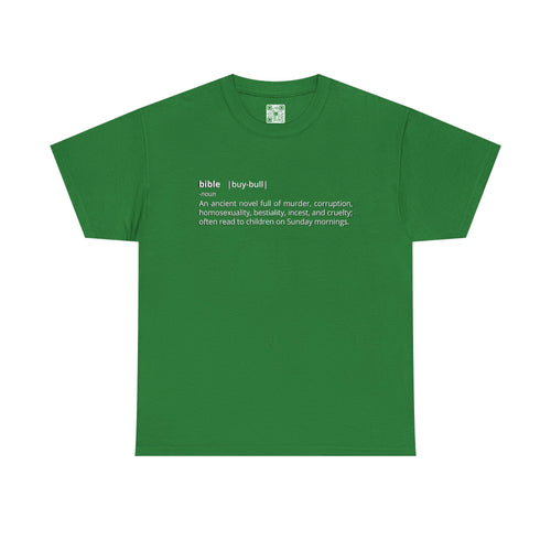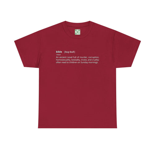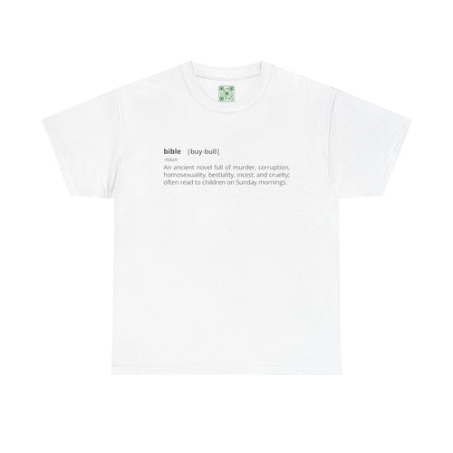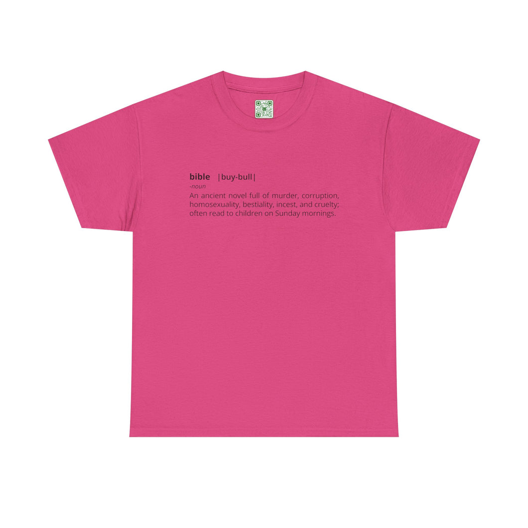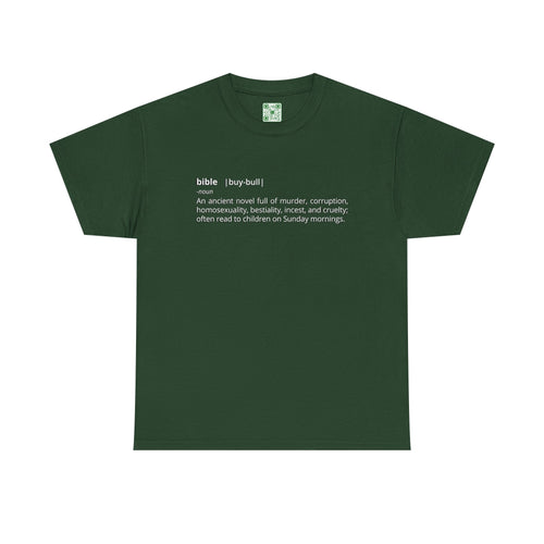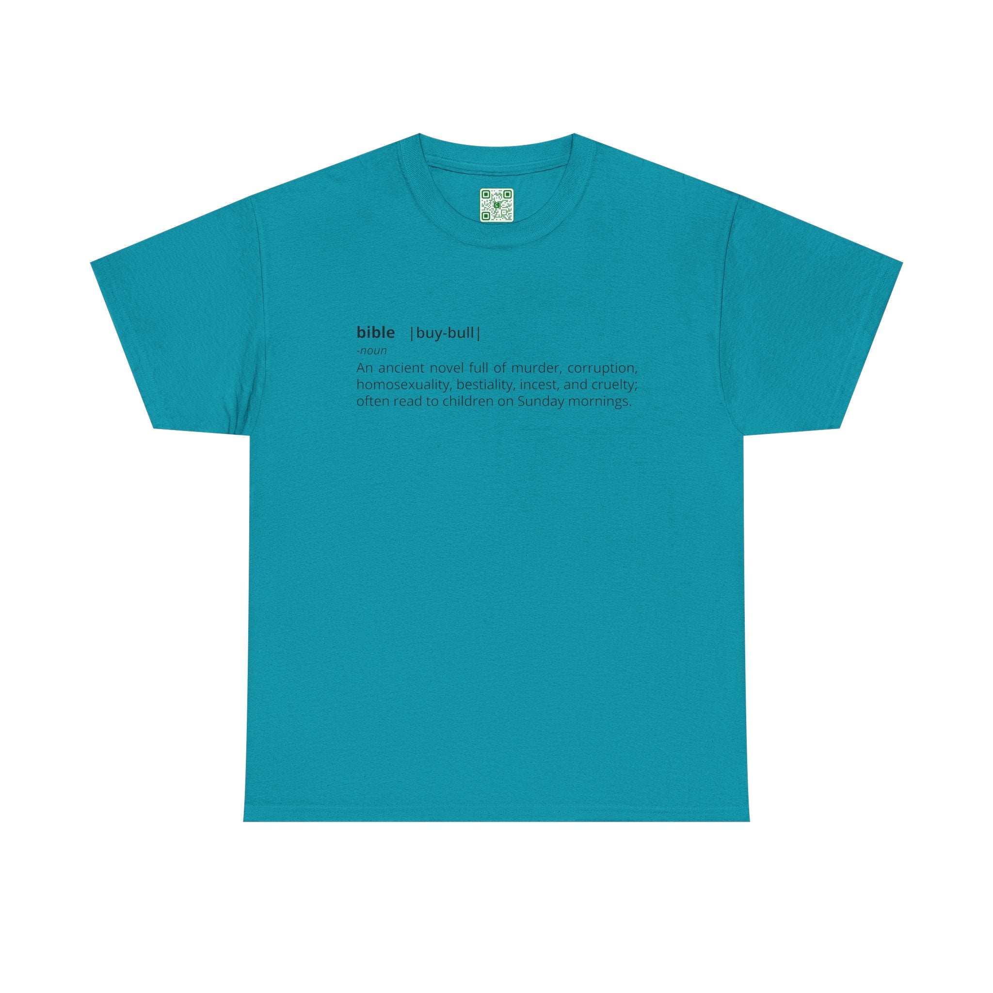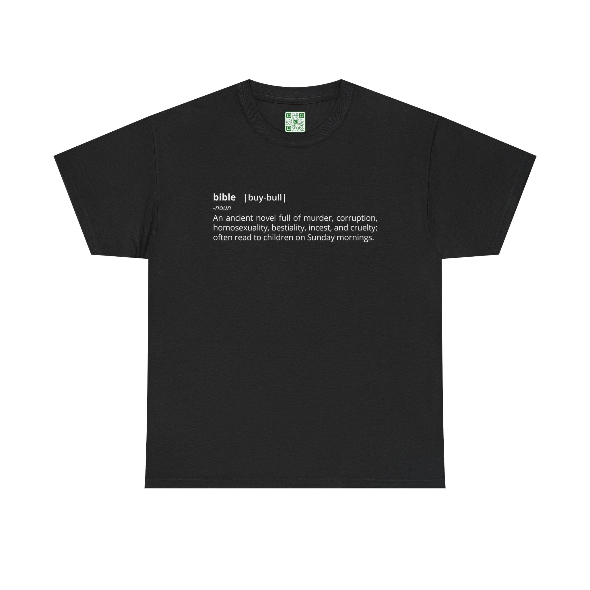"Bible - An ancient novel full of murder, corruption, homosexuality, bestiality, incest and cruelty; often read to children on Sunday mornings." - Unisex Heavy Cotton Tee